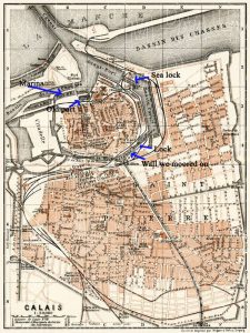 - With canals surrounding it, the oldest part of Calais (Calais – Nord) is situated upon a manmade island, whilst the newest section of St – Pierre is situated to the S – SE. The blue text and arrows highlight where Gratis moored and the locks passed through.